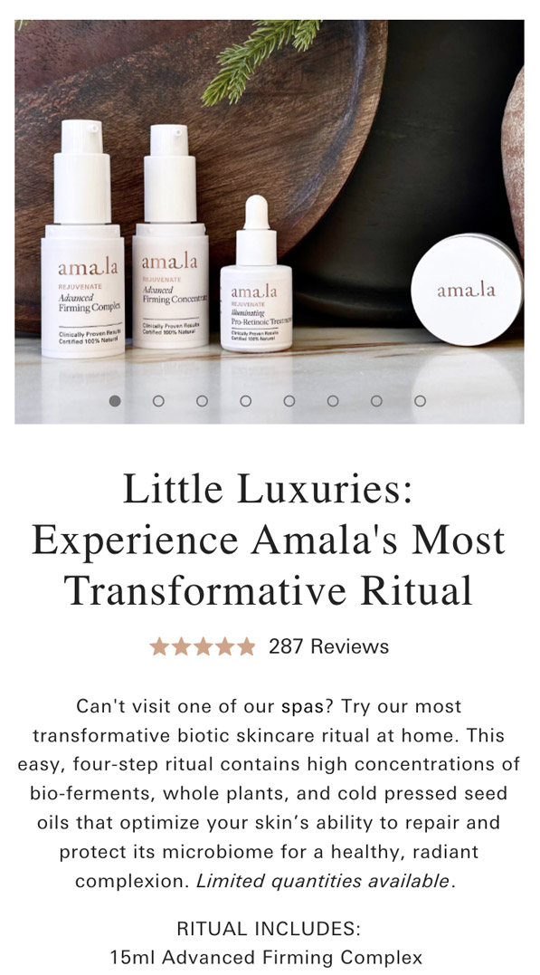 Visually arresting photography transports customers into the ingredient focused product line the Amala brand is well known for. Site UX incorporates insights from field research, filtering the product experience. Customers can shop by collection or by skin concern and narrow choices through filters to arrive at a targeted product recommendation. Deluxe sample selector in cart and product ratings in customer account add luxury service touches, and mobile responsive interface allows the customer to navigate a seamless shopping experience.